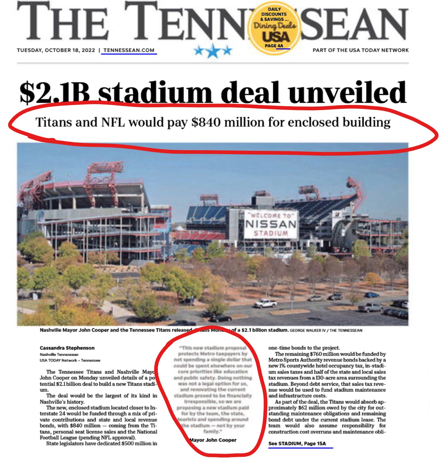 J C Bradbury On Twitter Check Out The Framing On Today S Tennessean Banner Front Sub Head Is Not The Taxpayers 1 26 Billion Cost But The Owner S Minority Contribution And A Misleading Pro Stadium Quote From